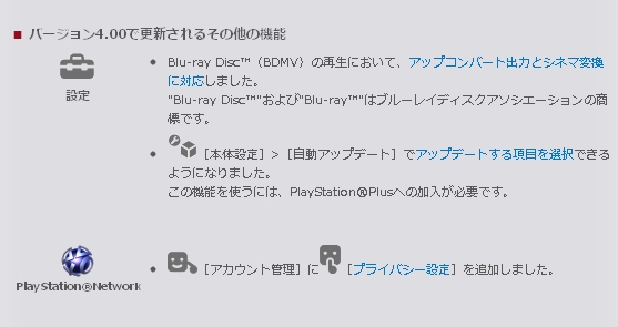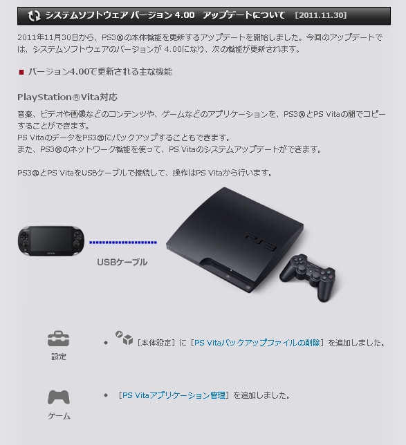 2011年11月30日から、PS3®の本体機能を更新するアップデートを開始。今回のアップデートでは、システムソフトウェアのバージョンが 4.00になり、次の機能が更新されます。